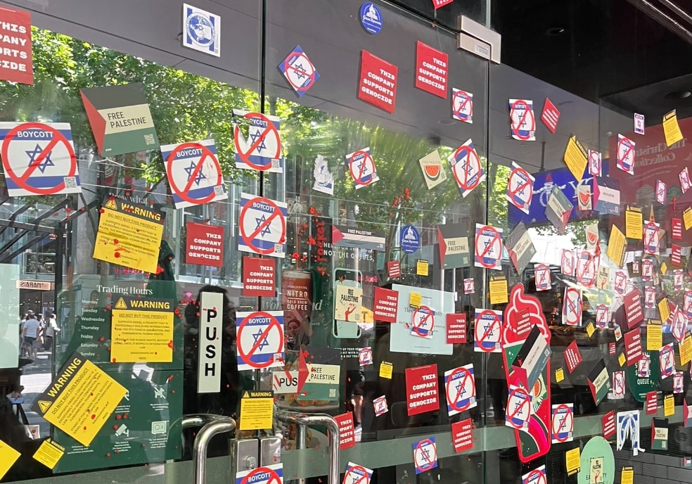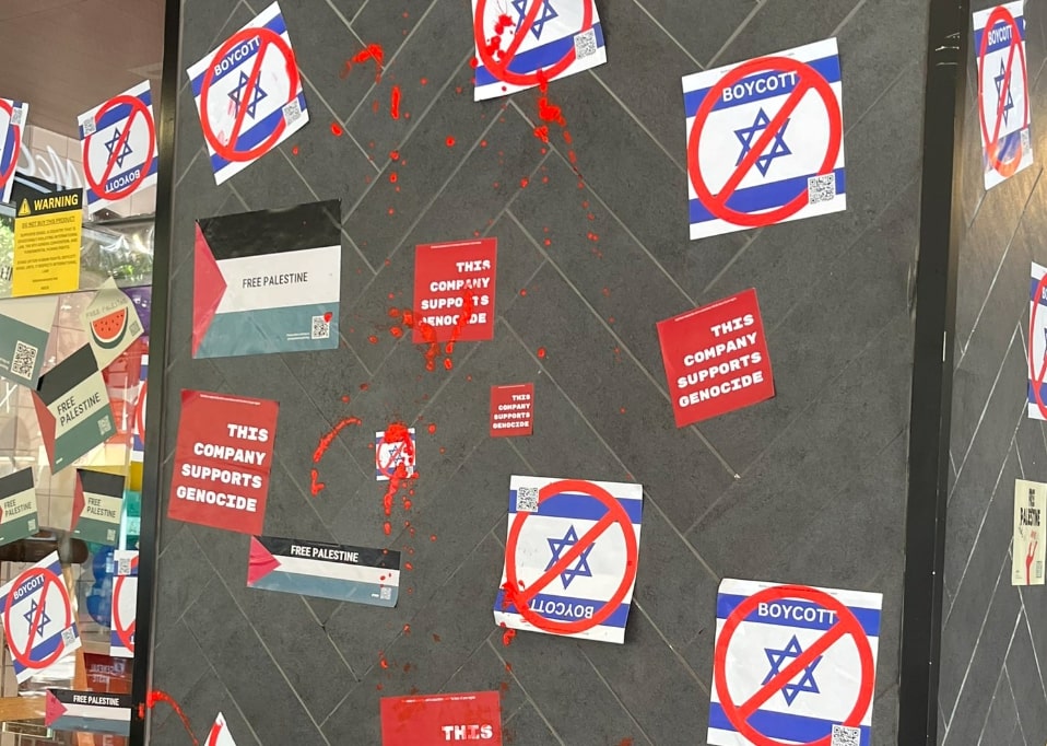 Adapun stiker itu tertempel dan menutupi di hampir seluruh permukaan dinding kaca gerai Starbucks dengan tulisan “perusahaan ini mendukung genosida” dan “Free Palestine”.