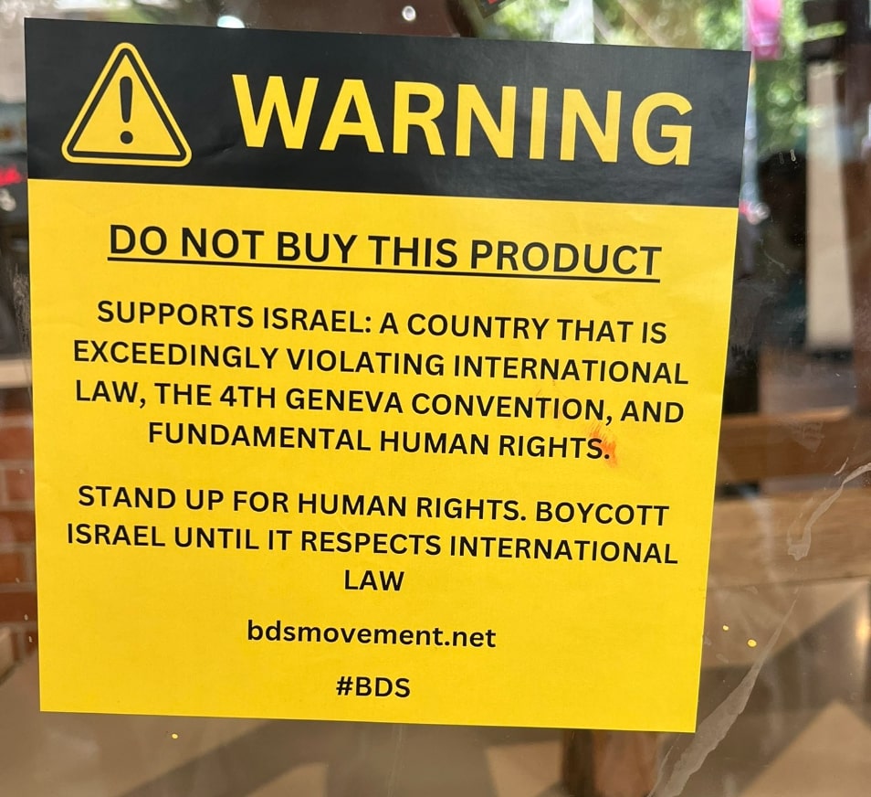 “Jangan membeli produk ini. Israel negara yang sangat melanggar hukum internasional, konvensi jenewa ke-4, dan hak asasi manusia. Kami berdiri untuk hak asasi manusia. boikot Israel sampai ia menghormati hukum internasional,” tulis salah satu stiker itu.