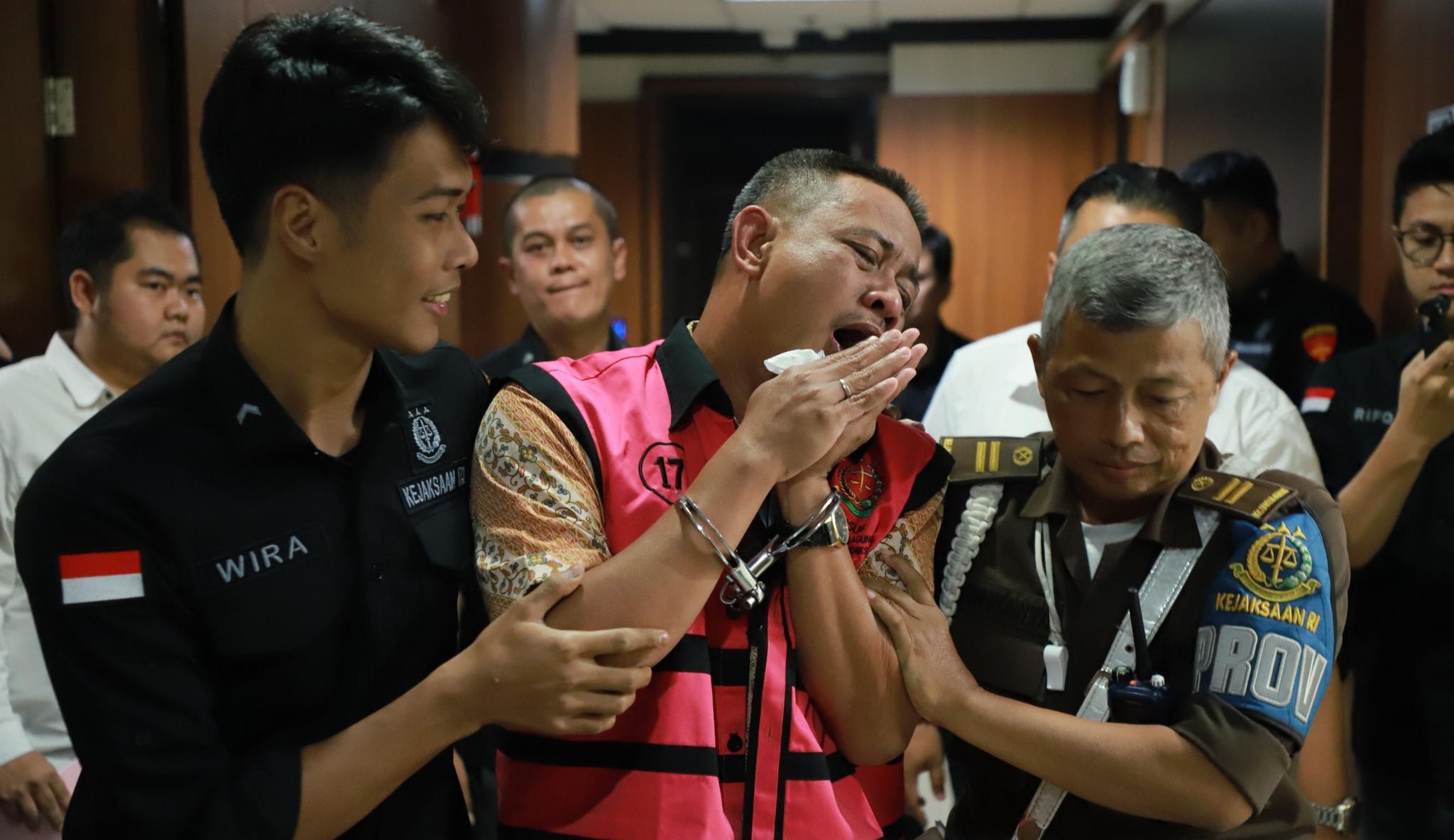 Supianto menangis kencang seraya memegangi tisu. Ia juga sempat berupaya menutupi wajahnya dari awak media yang sudah menanti konferensi pers Kejagung terkait kasus ini.