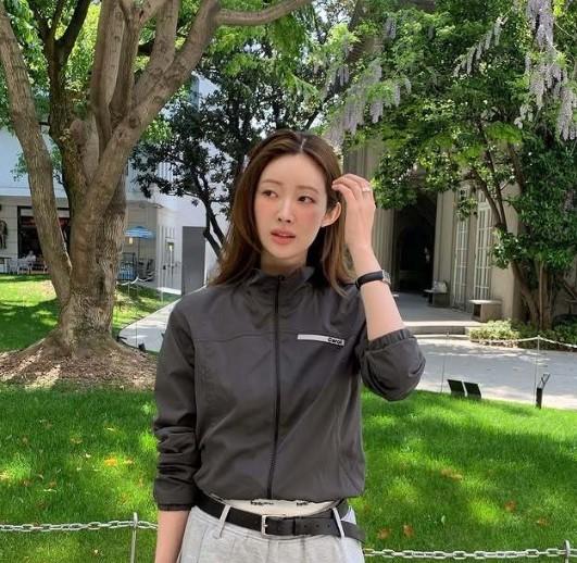 Cha Jeong-won memadukan jaket kerja hitam sederhana dengan rok tenis abu-abu cerah yang memiliki desain lipit, menambah kesan ceria pada penampilannya.