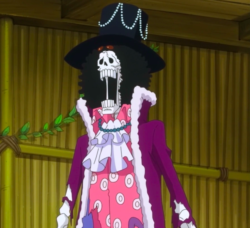 Brook adalah musisi dengan penampilan unik sebagai tengkorak! Ia memiliki kemampuan dari buah iblis Yomi Yomi no Mi, yang membuatnya hidup kembali setelah mati. Brook selalu menghibur teman-temannya dengan lagu-lagunya dan bercita-cita menemukan lagu legendaris. Siapa yang nggak pengen denger lagu dari tengkorak?