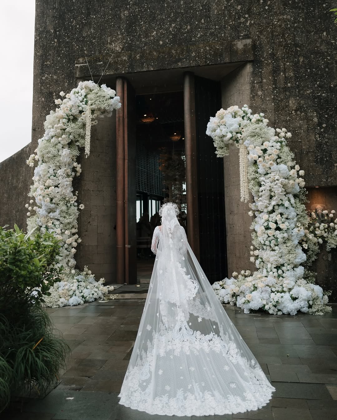 Selain gaun yang memukau, Shenina juga menggunakan mahkota perak yang dipadukan dengan veil panjang menjuntai. Perpaduan aksesori ini memberikan kesan elegan dan mewah, membuatnya tampak semakin bersinar di hari istimewanya.