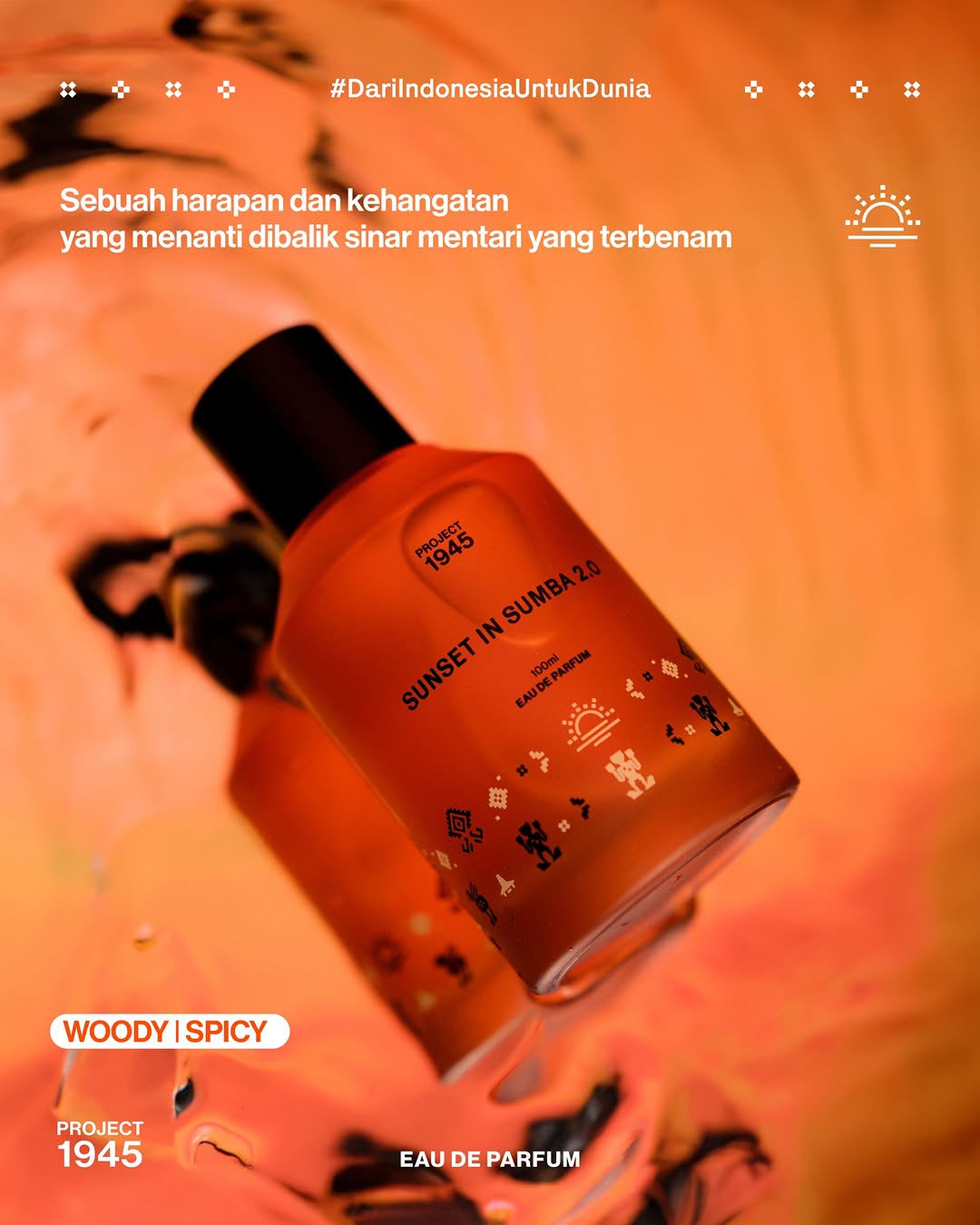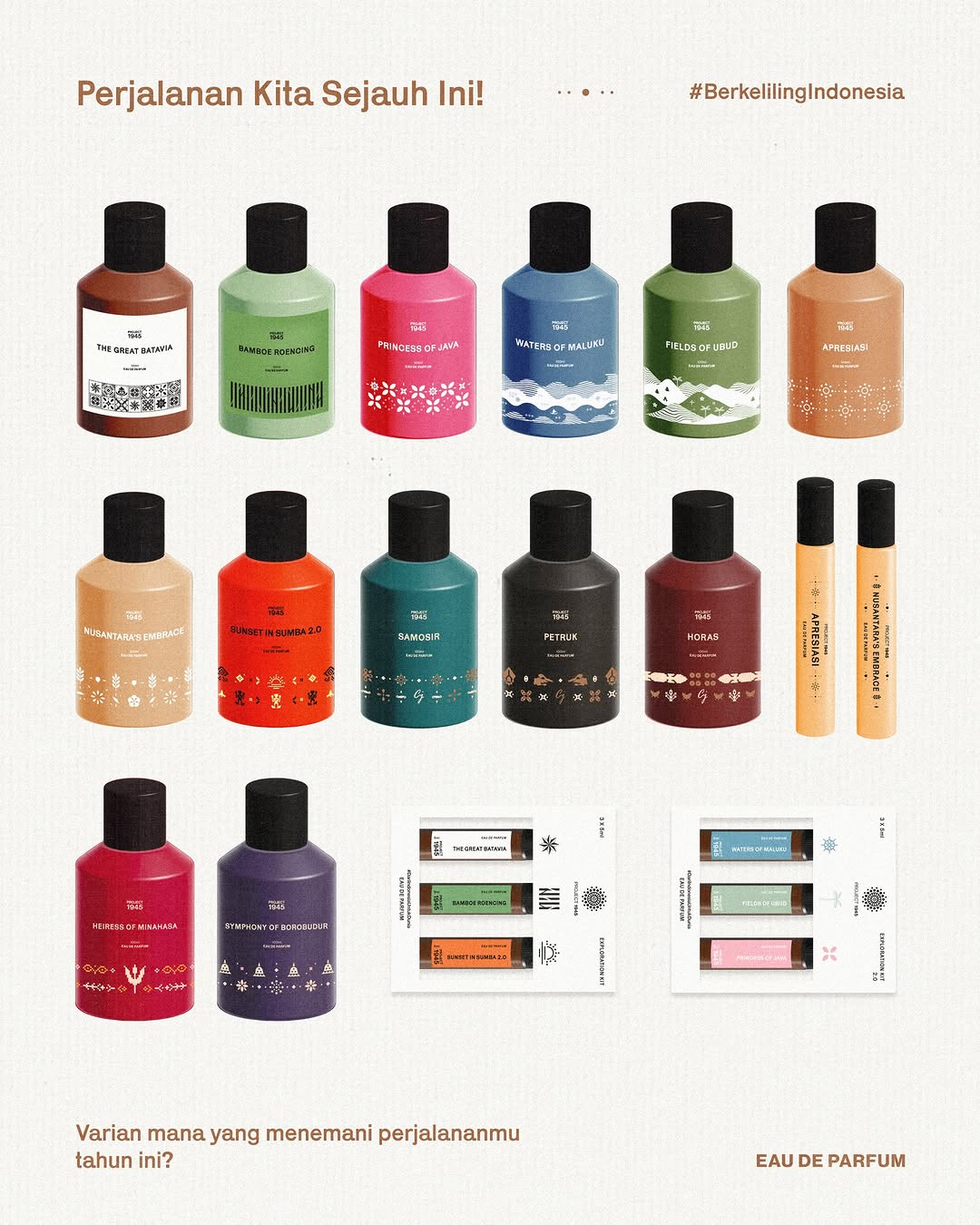 Dengan membawa tema eksplorasi aroma khas Indonesia, Project 1945 menciptakan parfum yang menggambarkan pesona berbagai daerah, mulai dari keharuman rempah khas Batavia, kesegaran laut Maluku, hingga kehangatan matahari terbenam di Sumba. Setiap botol parfum bukan hanya menghadirkan aroma yang khas, tetapi juga membawa cerita di baliknya.