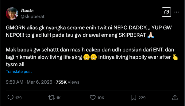 "GMORN (good morning) alias gak nyangka serame ini twit ini, nepo daddy. Yup, gua nepo! Tapi glad lu pada tahu gua dari awal emang skipberat."