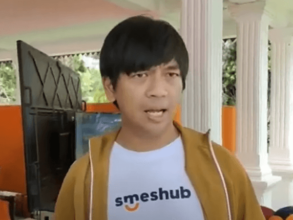 Rian tampak menyerahkan satu karung besar untuk korban gempa. Rian hadir menggunakan kaus putih dan menggunakan jaket berwarna cokelat.