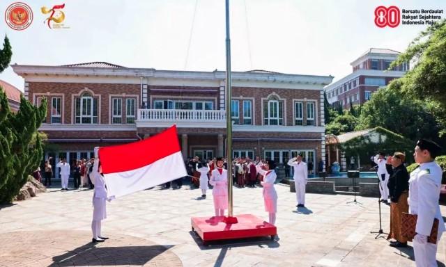 Pantau - Konsulat Jenderal Republik Indonesia (KJRI) Shanghai menggelar upacara pengibaran bendera merah putih di lapangan terbuka untuk pertama kalinya dalam rangka memperingati HUT ke-80 Republik Indonesia bersama sekitar 300 warga negara Indonesia (WNI) di Shanghai.