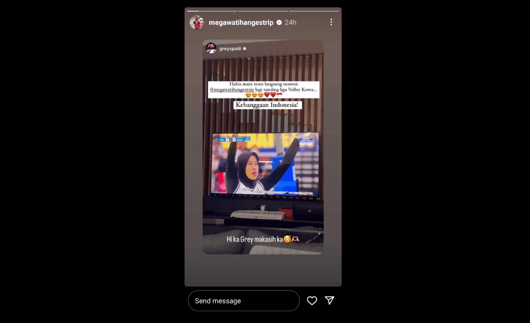 "Habis main tenis langsung nonton @megawatihangestrip tanding di Liga Voli Korea. Kebanggaan Indonesia!" tulis Greysia Polii melalui instagram story pada akun pribadinya @greyspolii.