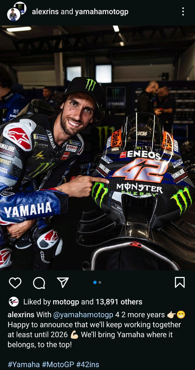 “Kontrak Alex untuk dua tahun ke depan merupakan bagian penting dari rencana kami untuk proyek MotoGP. Alex bukan hanya pembalap yang sangat berbakat dan cepat, tetapi ia juga cerdas secara teknis, pekerja keras, dan pemain tim sejati,” kata Direktur Pelaksana Yamaha Motor Racing Lin Jarvis.