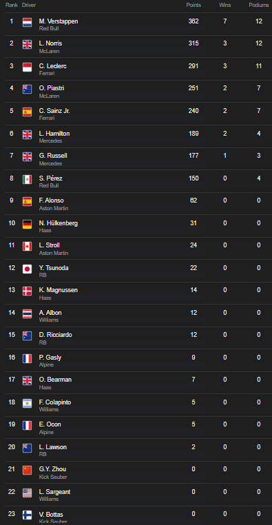 Setelah Verstappen kalah di Amerika Serikat, Norris berhasil memperkecil selisih menjadi 47 poin, dengan total 315 poin, dan hanya terpaut 10 poin setelah hasil di Meksiko. Kini, dengan 4 balapan tersisa, Norris masih memiliki peluang besar untuk mengejar sang juara bertahan.