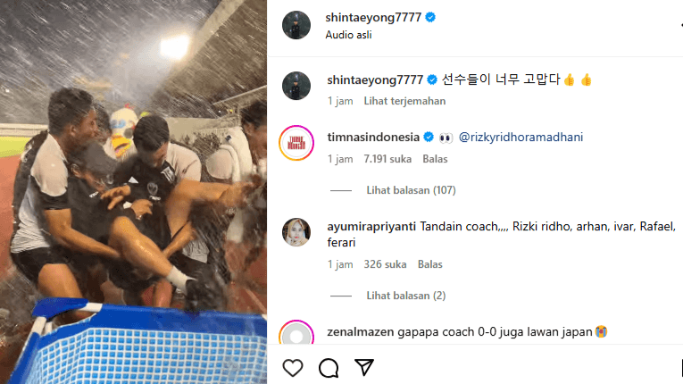 Momen tersebut terlihat begitu ceria ketika tiga pemain timnas, yakni Ivar Jenner, Rafael Struick, dan Rizky Ridho, bahu-membahu menggotong Shin Tae-yong ke arah sebuah bak berisi air.