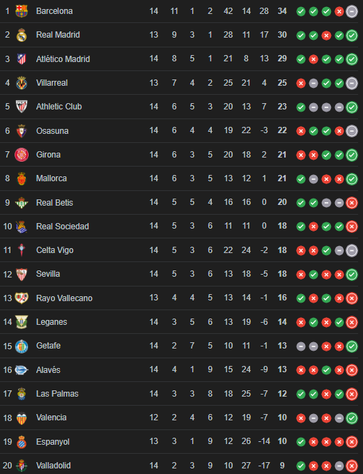 Di puncak klasemen, Barcelona masih memimpin meskipun hanya mampu menambah 1poin pada pekan ke-14. Tim Catalan ini gagal meraih kemenangan setelah melepas keunggulan 2-0 saat bertandang ke Celta Vigo. Pada sepuluh menit terakhir pertandingan di Balaidos, Barcelona kebobolan dua gol dari tim tuan rumah.