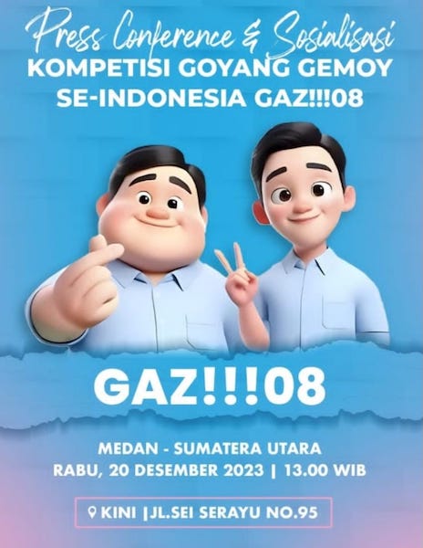 Jakarta: Tim Relawan Gibran A–Z (GAZ) 08 akan menggelar konfrensi pers dan sosialisasi kompetisi goyang gemoy se-Indonesia di Medan, Sumatera Utara. Sosialisasi tersebut bakal dihadiri berbagai komunitas, sanggar senam dan kelompok tari.