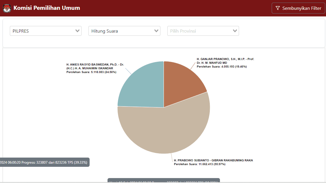 Menurut informasi yang dihimpun oleh Pantau.com dari situs resmi pemilu2024.kpu.go.id, pada Kamis (15/2/2024) pukul 06.00 WIB, telah tercatat sebanyak 323.807 suara masuk dari total 823.236 Tempat Pemungutan Suara (TPS), yang setara dengan 39,33%.