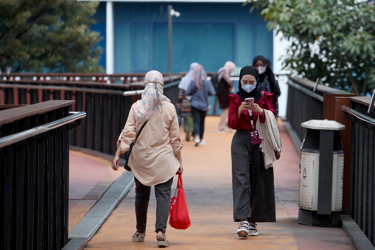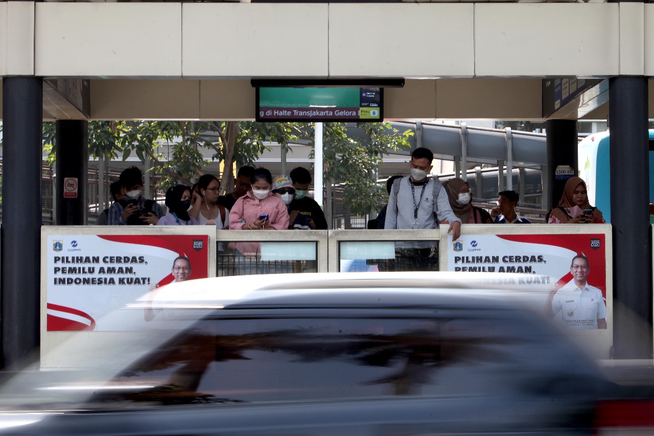 Potret para pegawai di Jakarta sedang menunggu angkutan umum TransJakarta.