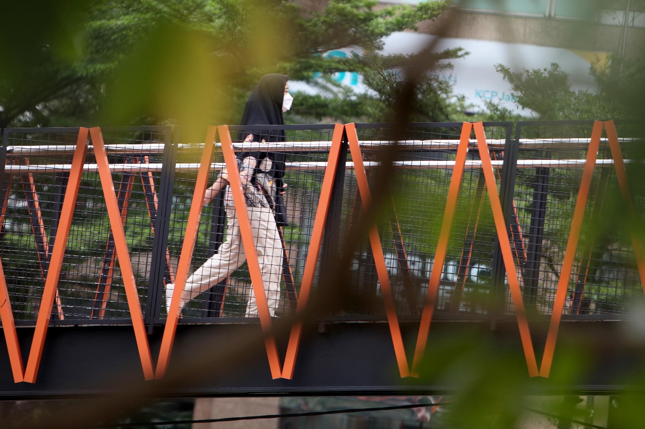 Seorang perempuan tampak berjalan menuju salah satu halte TransJakarta di kawasan Sudirman.
