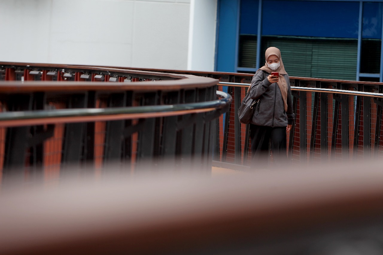 Terlihat pegawai Jakarta yang memainkan ponselnya seusai bekerja dan hendak pulang.