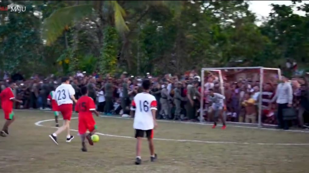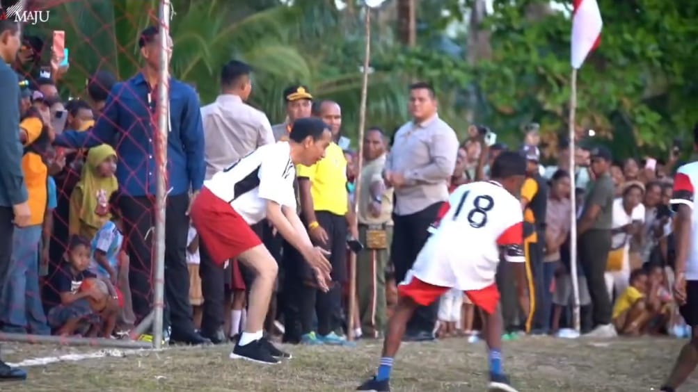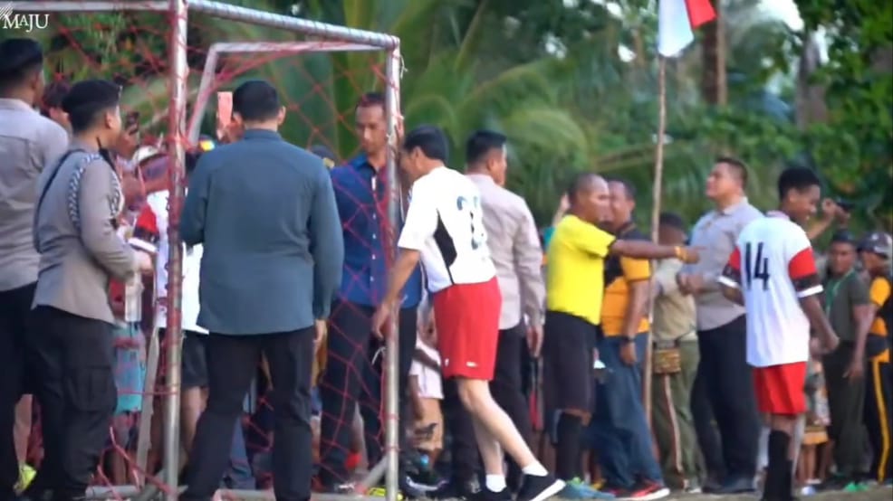 Potret Presiden Republik Indonesia (RI) Joko Widodo (Jokowi) bermain bola bersama anak-anak kecil di Lapangan Sorido, Kabupaten Biak Numfor, Provinsi Papua pada Rabu (22/11) kemarin.