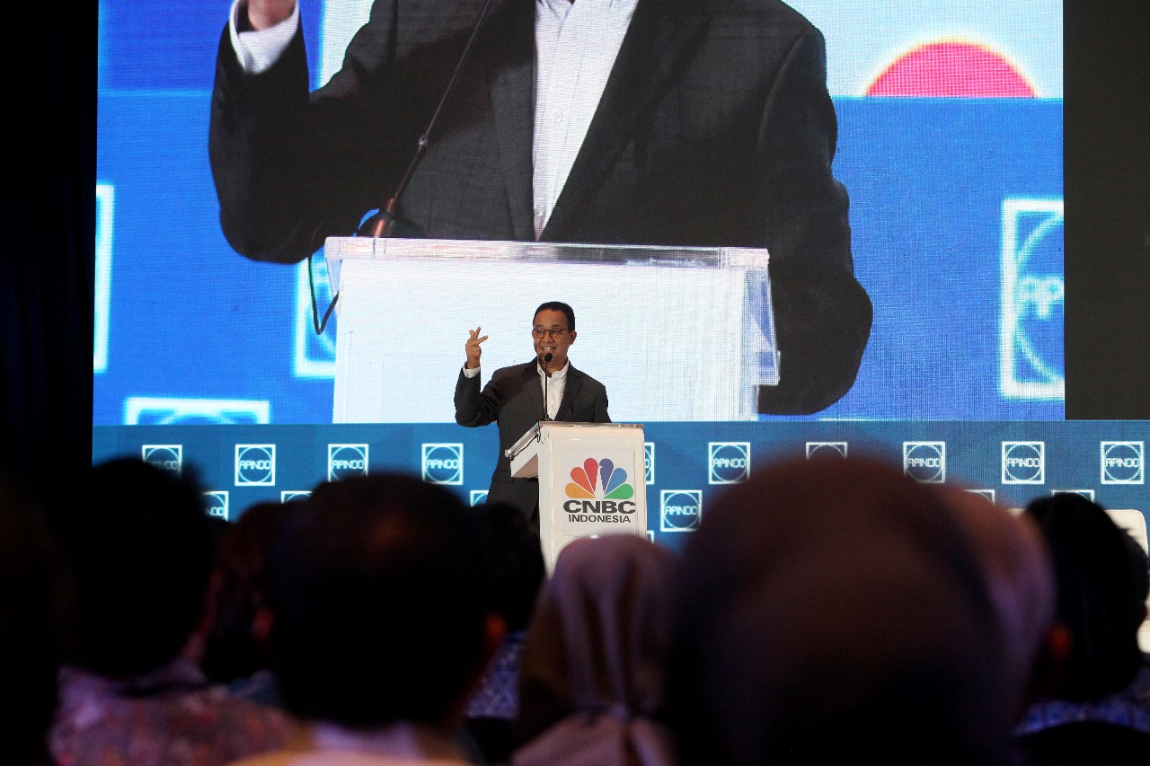 Capres nomor urut 1 Anies Baswedan menyampaikan paparan dalam Dialog Capres 2024 Asosiasi Pengusaha Indonesia (APINDO), Senin (11/12/2023).