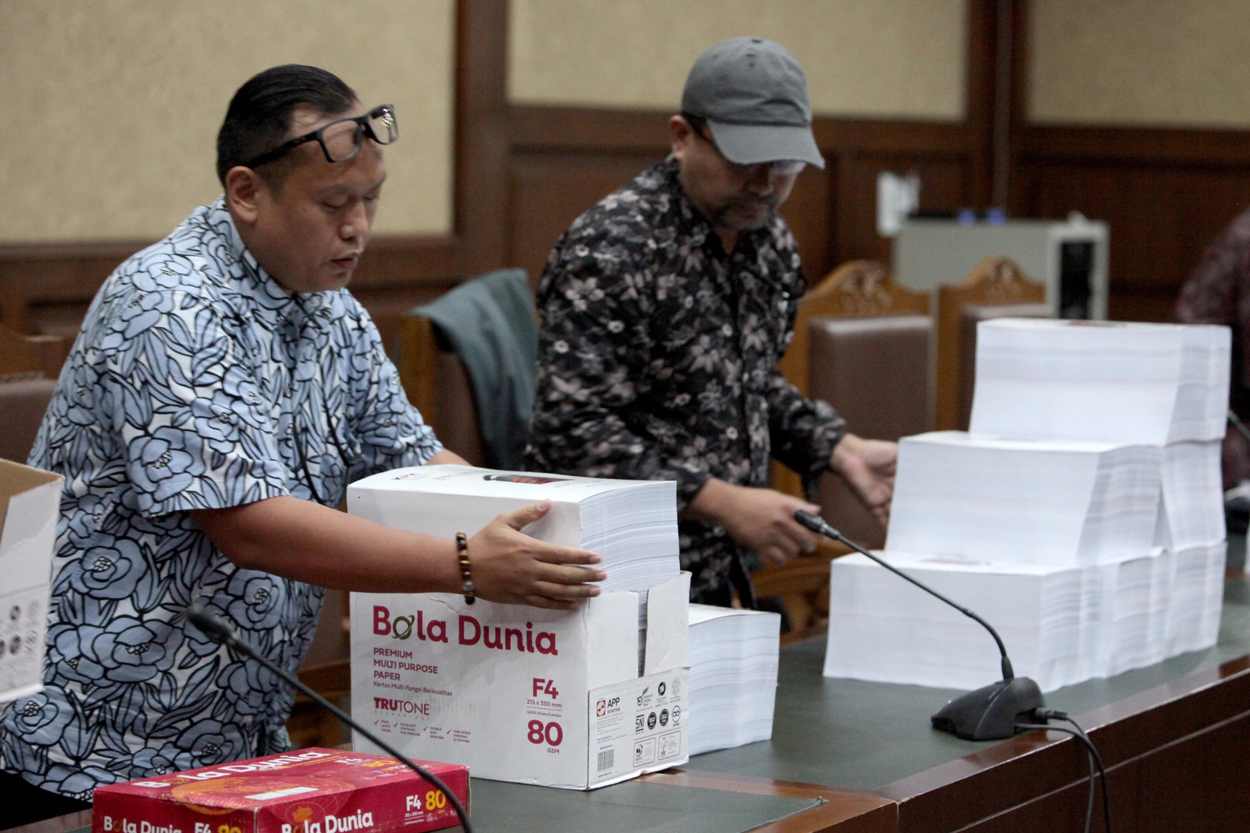 SYL didakwa menerima gratifikasi dan memeras anak buah yang totalnya mencapai Rp44,5 miliar. Tampak berkas-berkas SYL dipersidangan.
