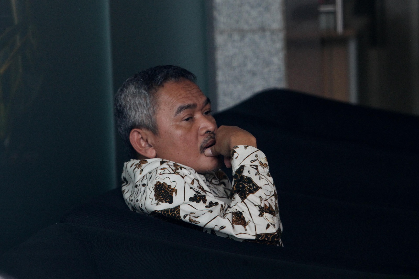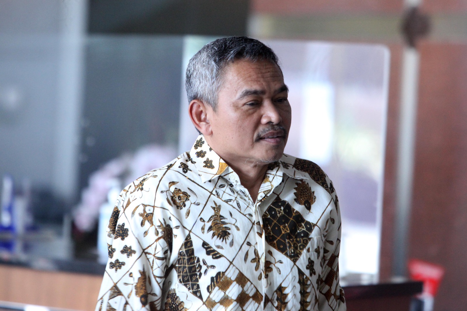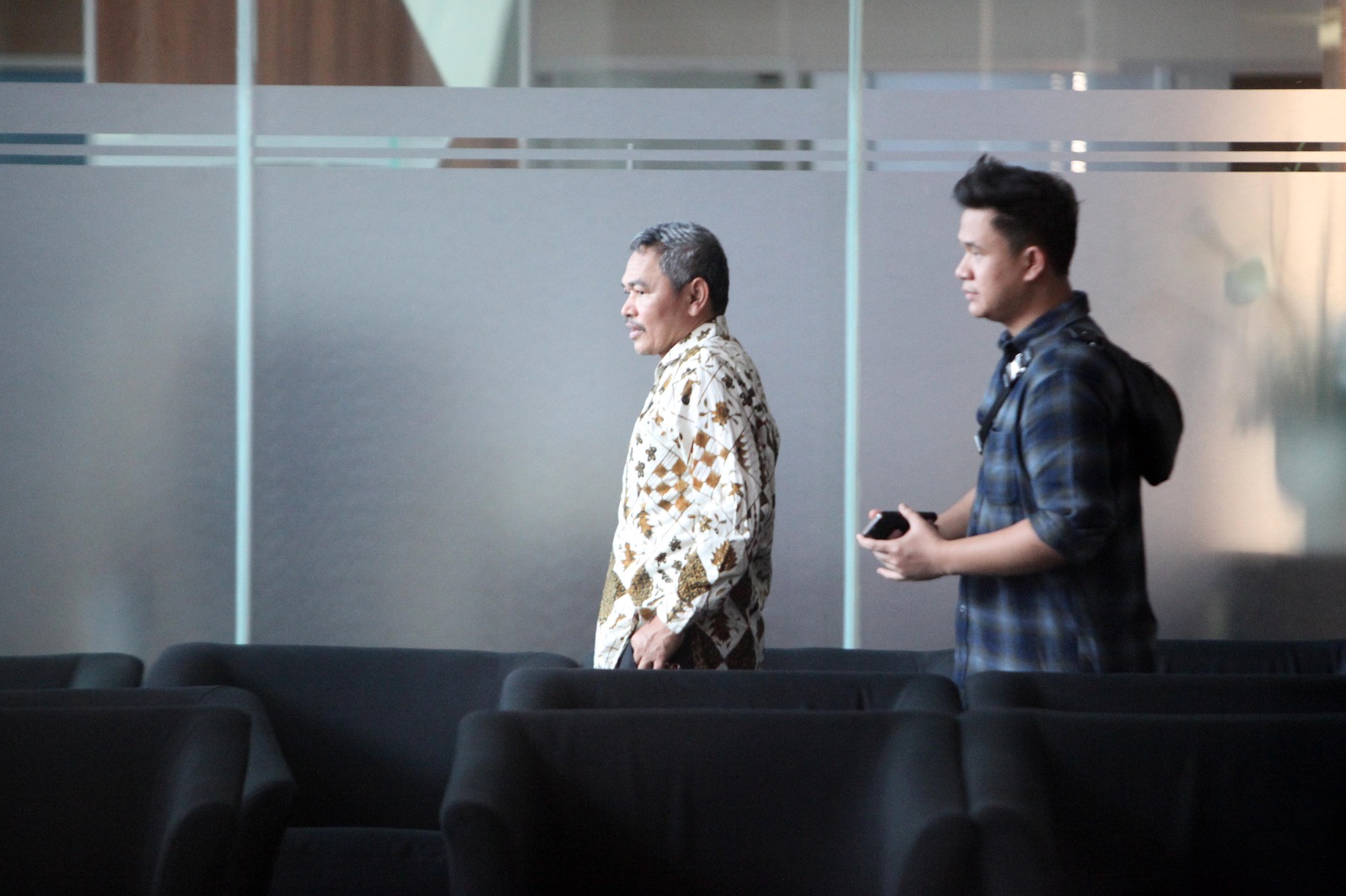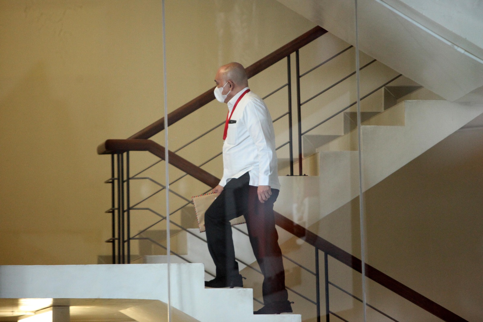 Heri Gunawan pertama kali tiba di Gedung Merah Putih pada pukul 12.30 WIB. Ia terlihat mengenakan kemeja putih dan masker.