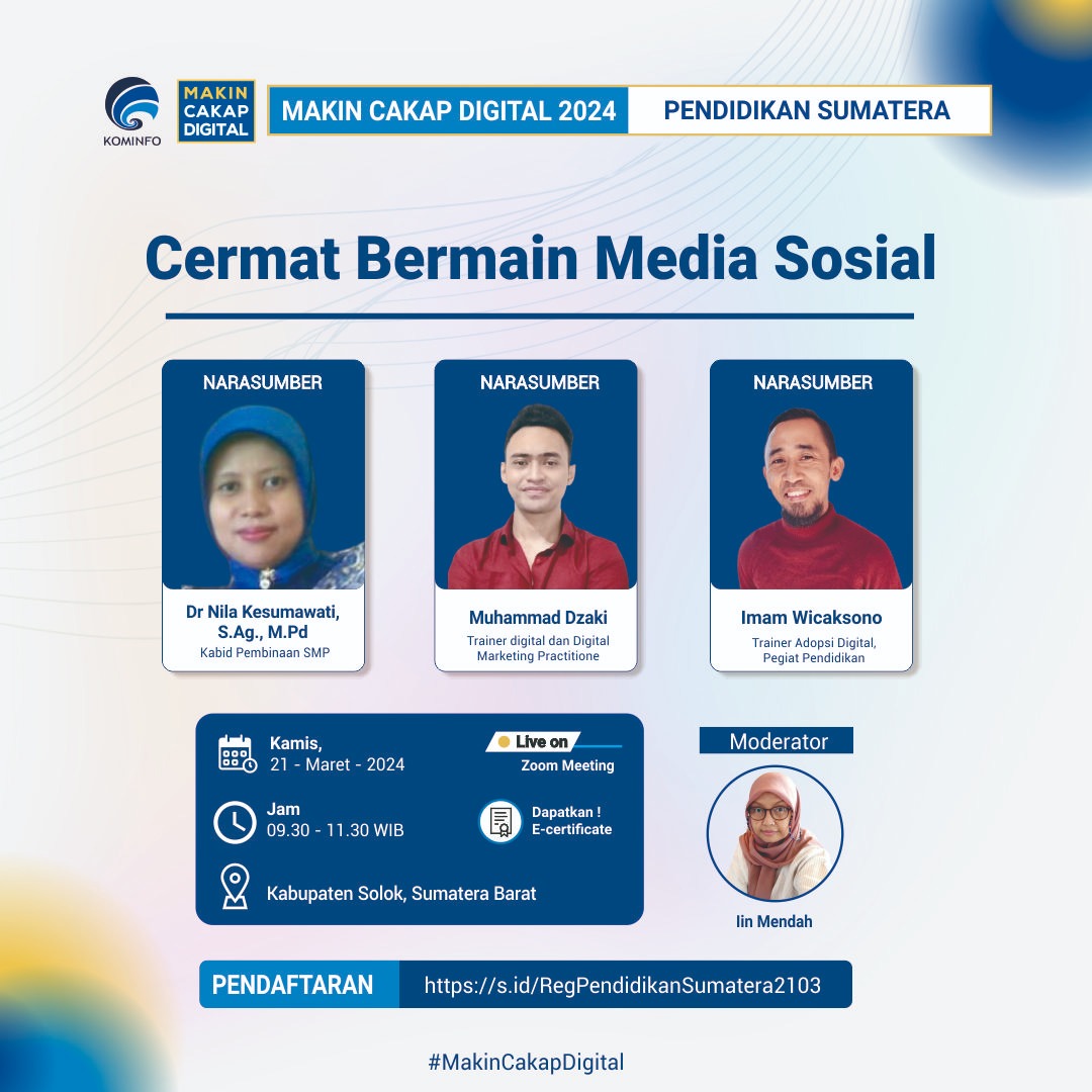 “Tidak terkecuali dalam konteks bermedia sosial,” kata Trainer Digital Entrepreneurship Academy Kominfo Muhammad Dzaki Riana saat menjadi narasumber dalam webinar literasi digital untuk segmen pendidikan, yang digelar Kementerian Komunikasi dan Informatika (Kemenkominfo) bersama Dinas Pendidikan dan Kebudayaan Provinsi Sumatera Barat di Kabupaten Solok, Kamis (21/3/2024).